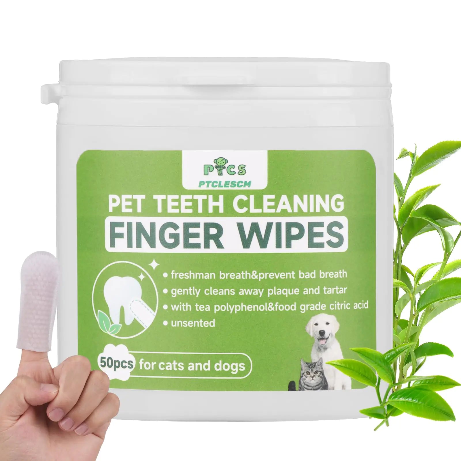 ["Freshen Breath: These convenient and gentle pet teeth cleaning finger wipes help instantly freshen your pets breath neutralizing bad odors after meals or outdoor play. Perfect for quick use at home or on-the-go whether after feeding during travel or just before a cuddle session these wipes leave your pets mouth feeling clean and refreshed." "Plaque Removal: Gently and effectively cleans away stubborn plaque and tartar buildup from your cat or dogs teeth promoting healthier gums and stronger teeth. Ideal for use after meals during grooming sessions or as part of your pet’s daily dental care routine. These wipes are perfect for keeping your pet’s mouth clean and fresh while preventing more serious dental issues like tooth decay and gum disease." Natural Ingredients: Expertly formulated with potent tea polyphenols and food-grade citric acid providing a safe gentle yet highly effective cleaning solution for your pet’s teeth and gums. Perfect for daily use whether after meals or during grooming these natural ingredients help remove plaque and tartar while leaving your pet’s mouth feeling refreshed and clean. Suitable for pets with sensitive teeth this formula ensures a non-toxic chemical-free cleaning experience making it ideal for at-home care or on-the-go freshening. "Unscented: These pet wipes are completely unscented for your pets ultimate comfort. Crafted from soft hypoallergenic materials they are gentle on sensitive skin and ideal for all fur types. Perfect for quick clean-ups after a muddy walk these wipes effectively remove dirt and debris without any harsh chemicals. Whether youre at home or on the go they provide a convenient solution for maintaining your pets hygiene leaving them feeling fresh and clean without any overwhelming fragrances. Ideal for daily grooming or spontaneous adventures these wipes ensure your furry friend stays comfortable and happy.cat toothbrush." "Convenient Pack: This pack includes 50 wipes perfect for both cats and dogs. Each wipe is designed to be thick and durable making them ideal for tackling tough messes while remaining gentle on your pets skin. The convenient resealable packaging ensures that the wipes stay moist and fresh ready for use anytime whether you’re at home on a road trip or at the pet park.pet dental finger wipes for cats.dog teeth cleaning wipes .pet dental finger wipes for cats."]